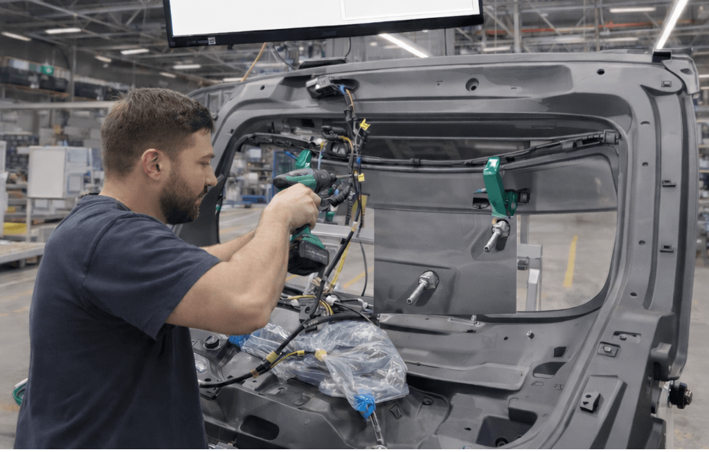System-guided assembly of tailgates in reverse sequence order and just-in-time delivery to production.